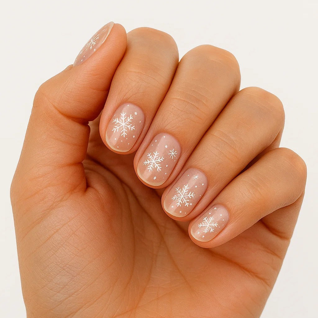 Base transparente con copos de nieve blancos y un acabado delicado que deja las manos con un aire invernal, limpio y sutil.