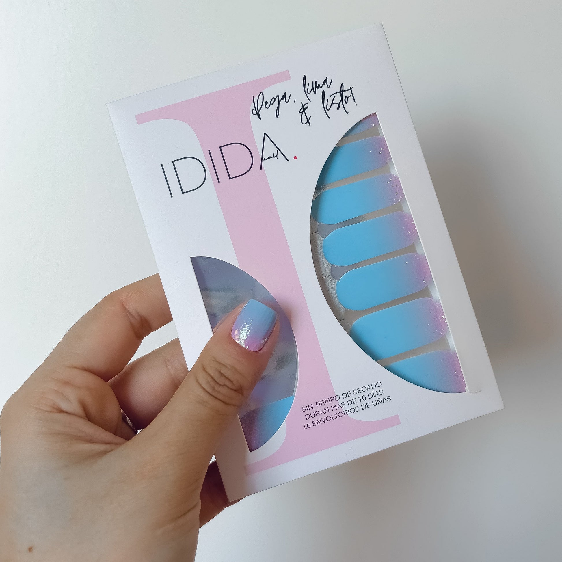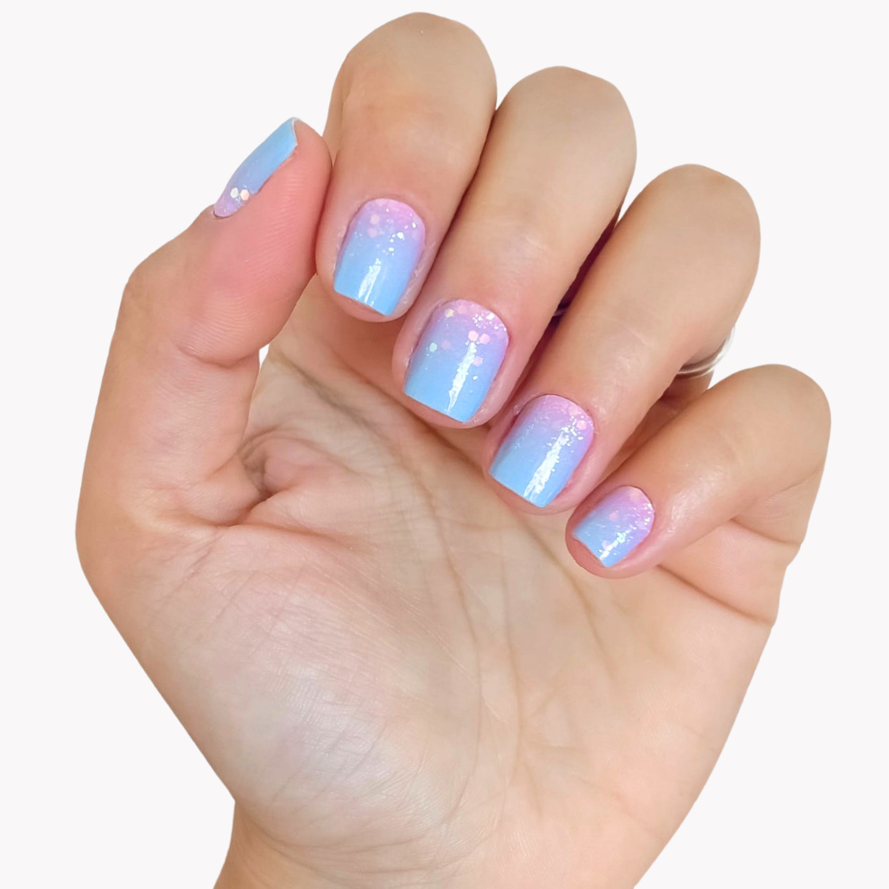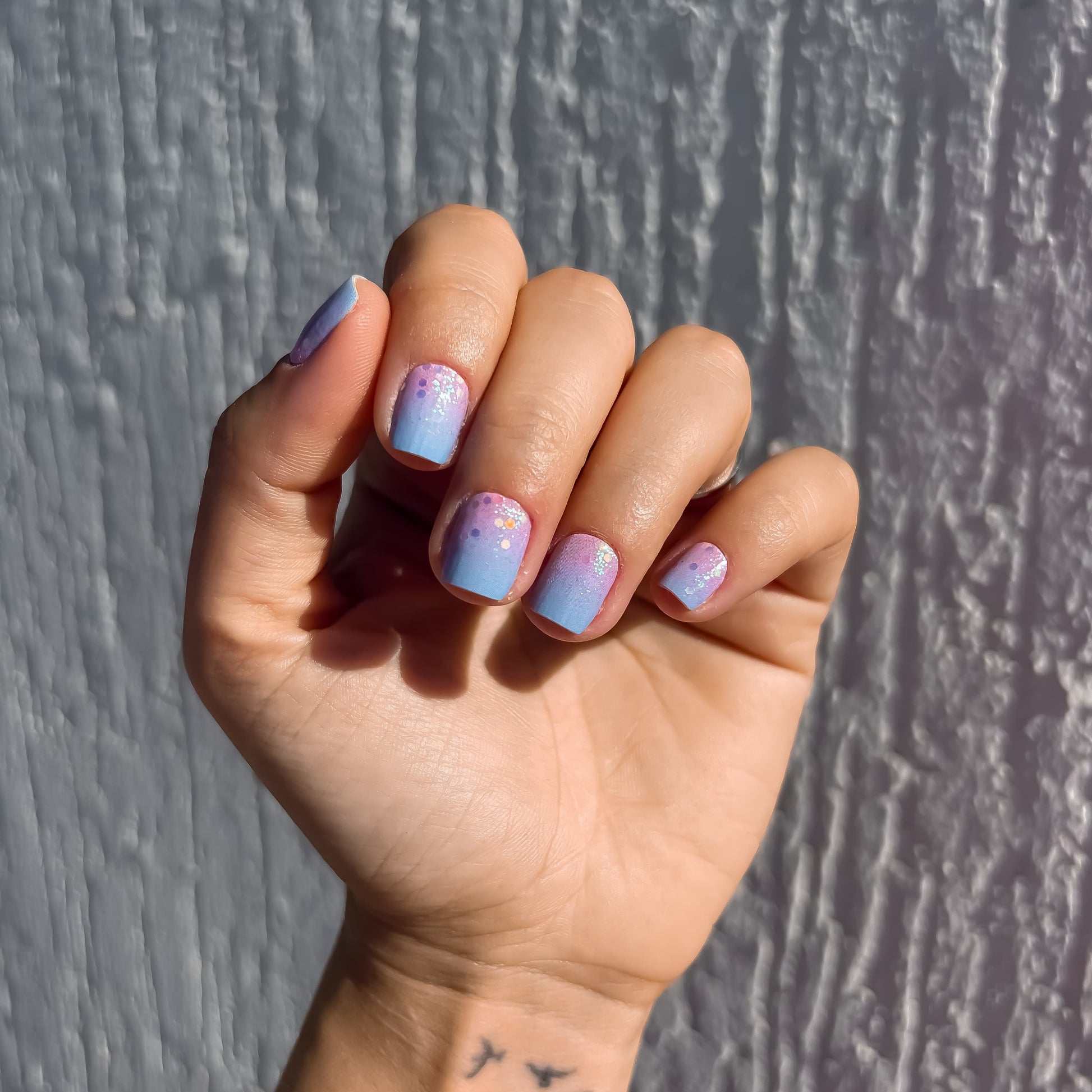 Un motif ombré rose-bleu avec une touche de paillettes à la base.