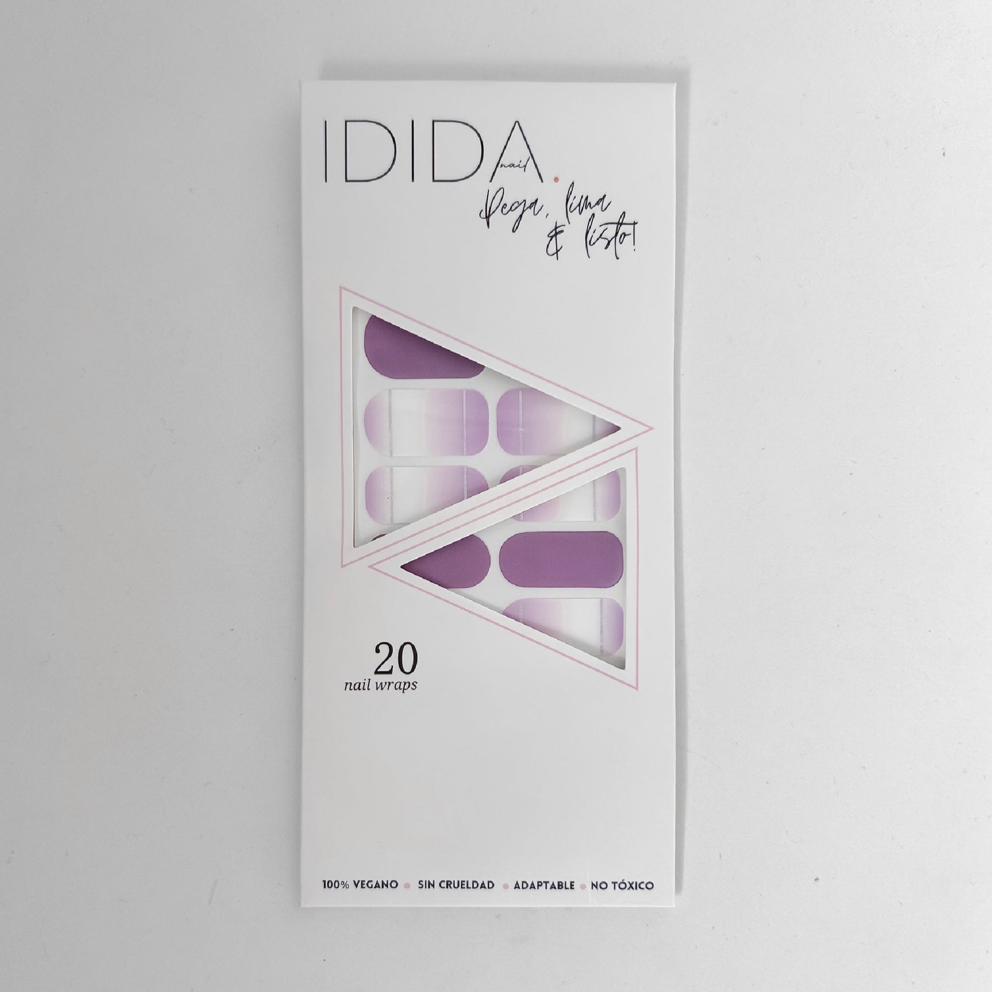 Un diseño ombré de color morado oscuro a blanco, adornado con una línea brillante y uñas con detalles en color malva.