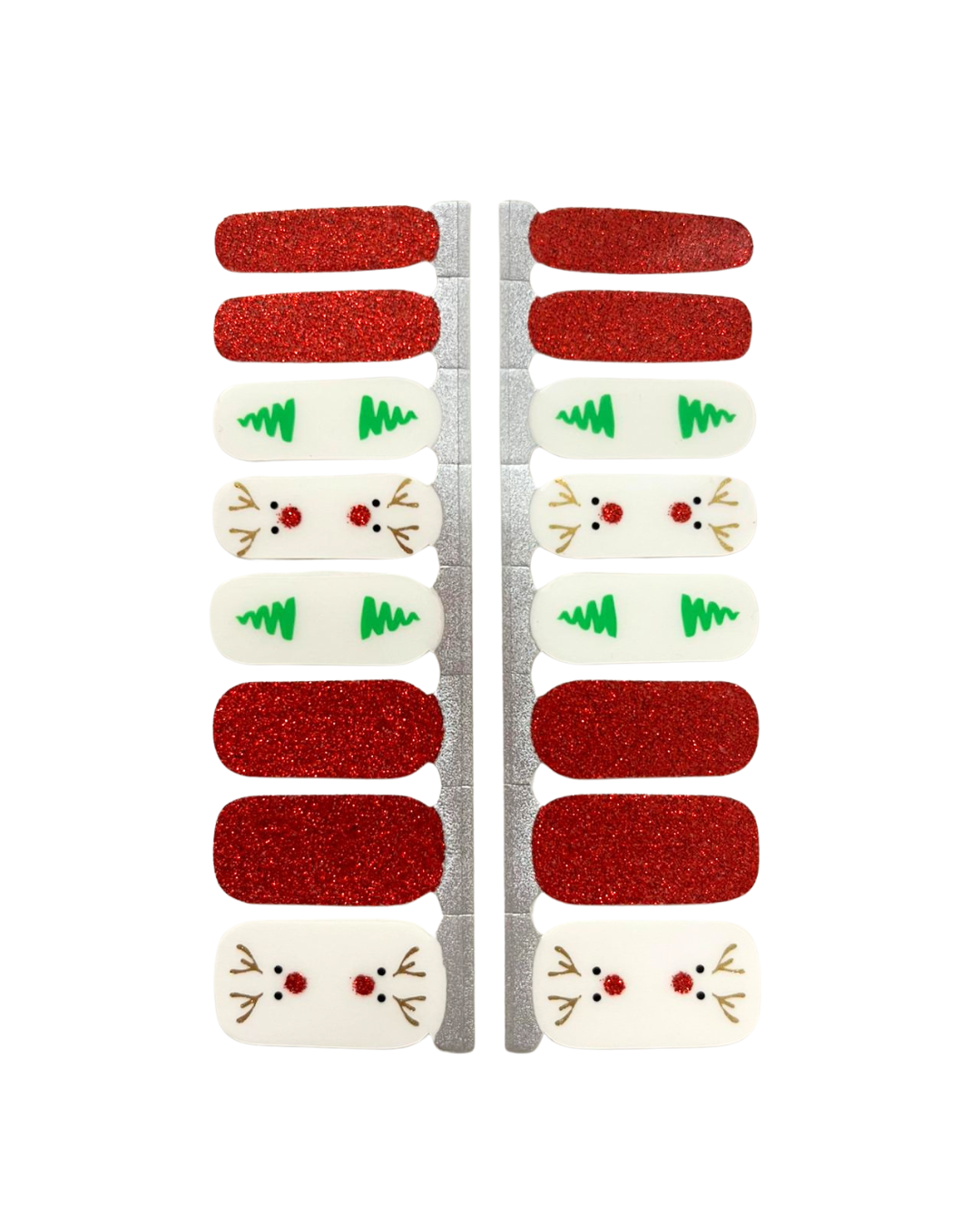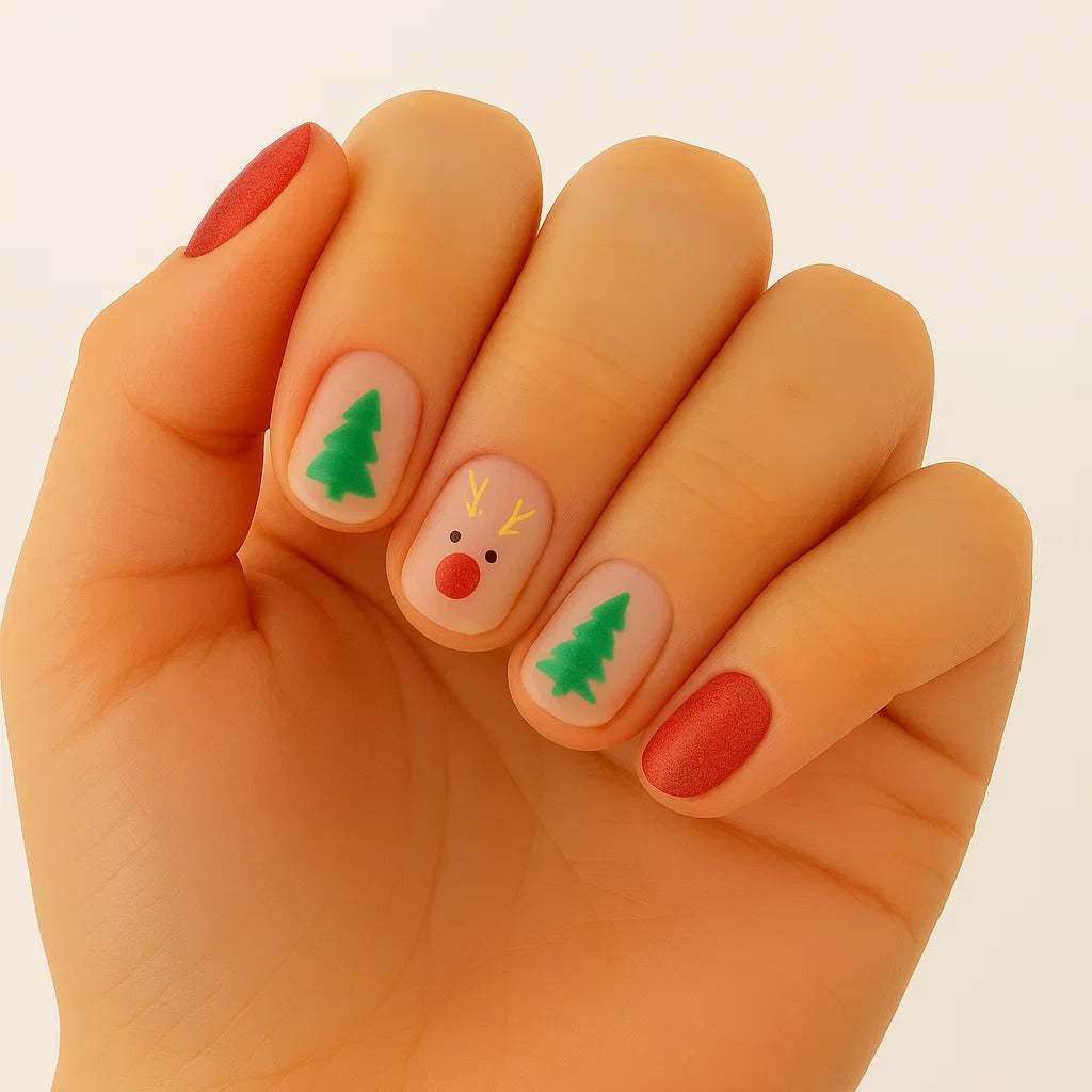 Un diseño navideño minimalista con base nude, árboles verdes y un reno discreto, combinado con acentos rojo mate para un look festivo y limpio