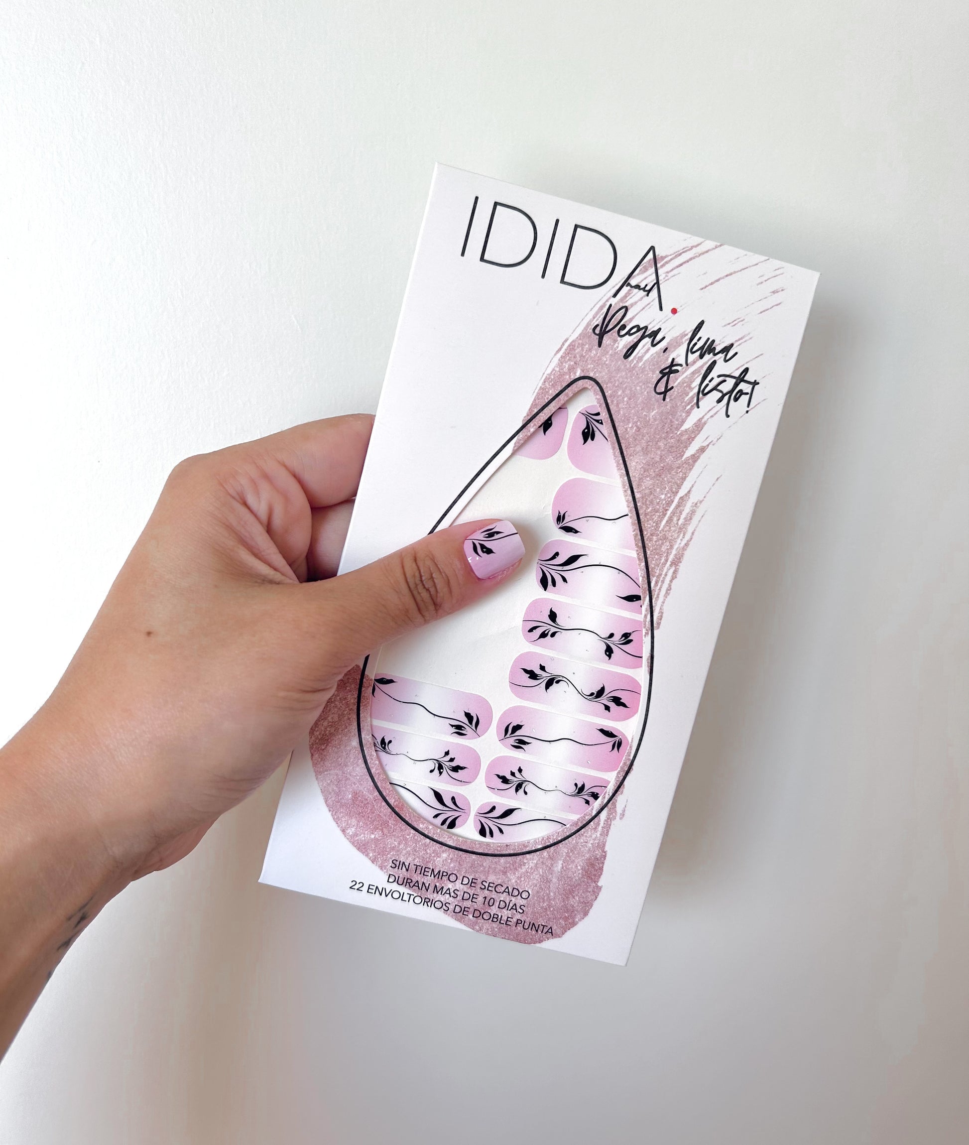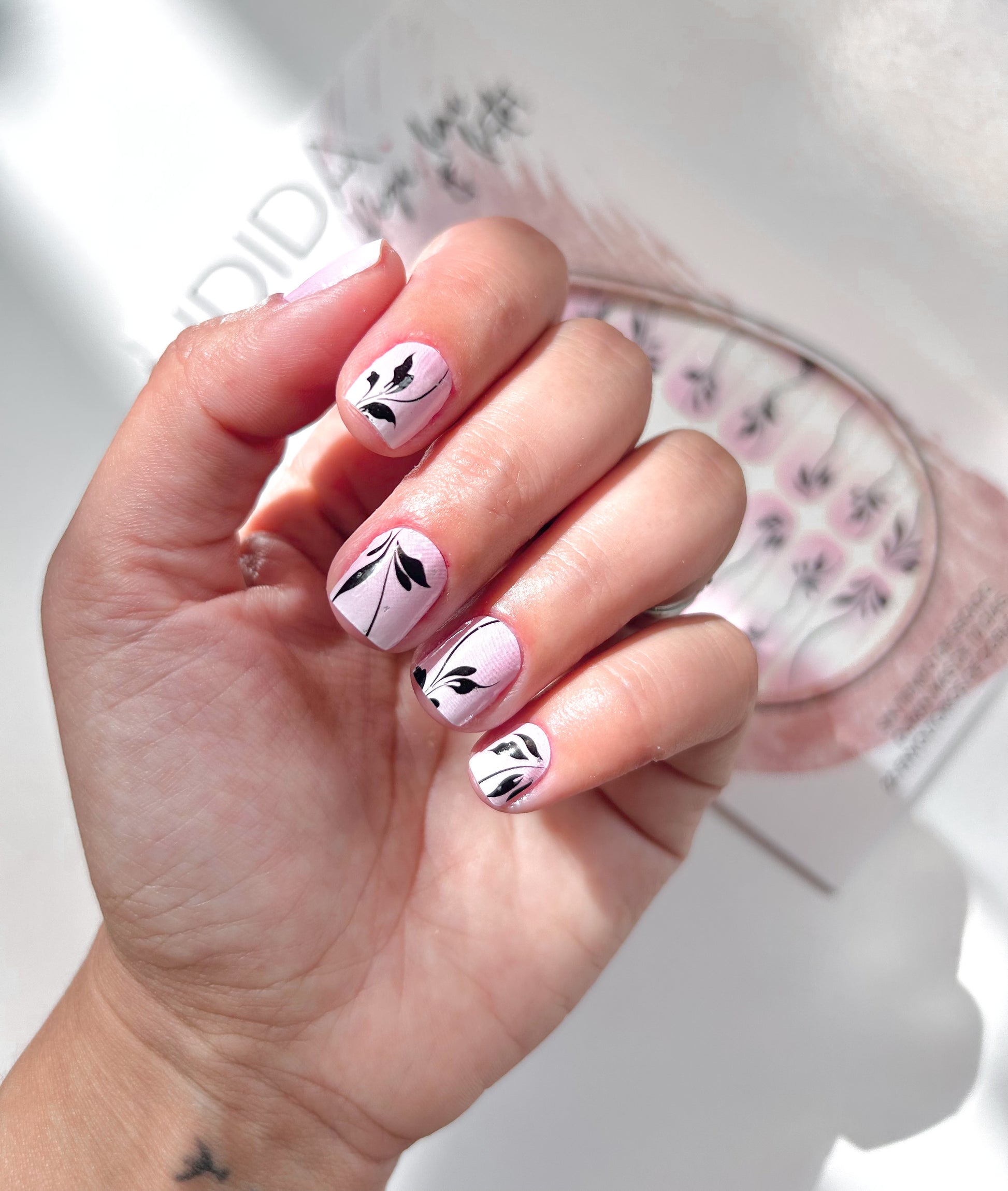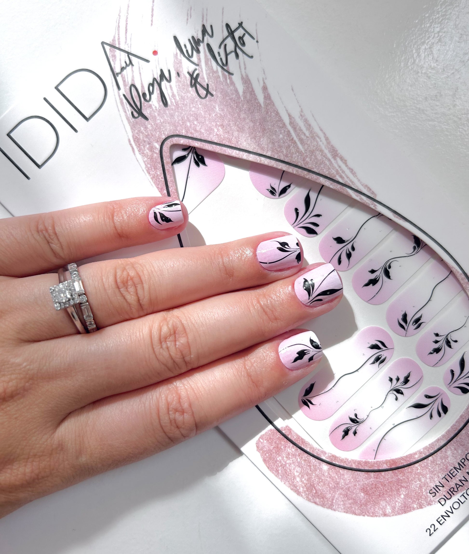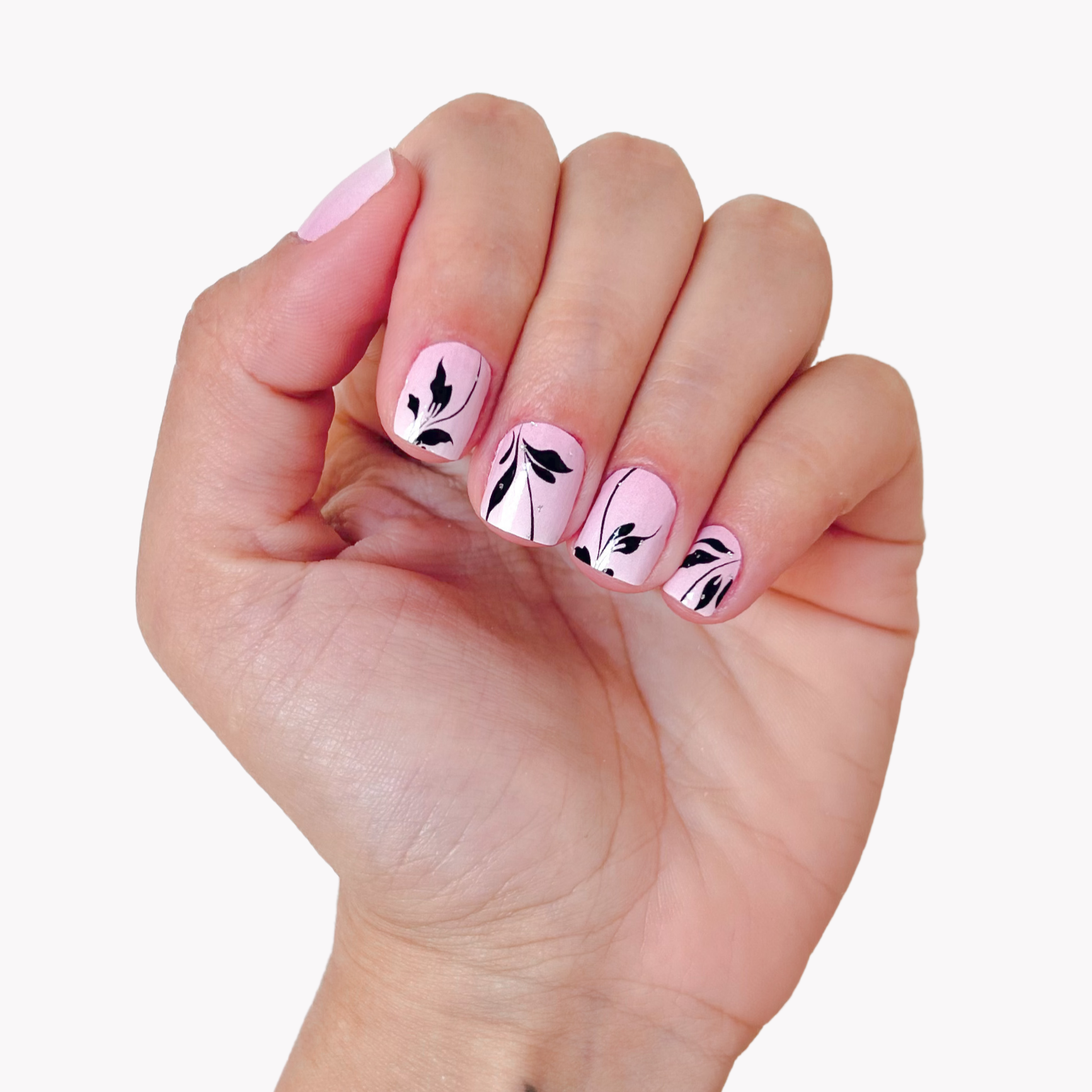 Nous vous présentons la tendance de l'ombré avec une touche d'originalité. Ce délicat dégradé de couleurs va du rose layette au blanc, orné de fleurs et de feuilles noires.