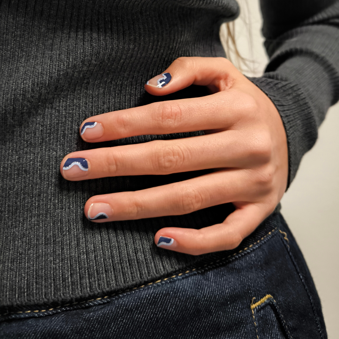 Un diseño elegante con olas en azul marino, que aporta un toque dinámico y sofisticado a tus uñas. Perfecto para un look único y moderno.