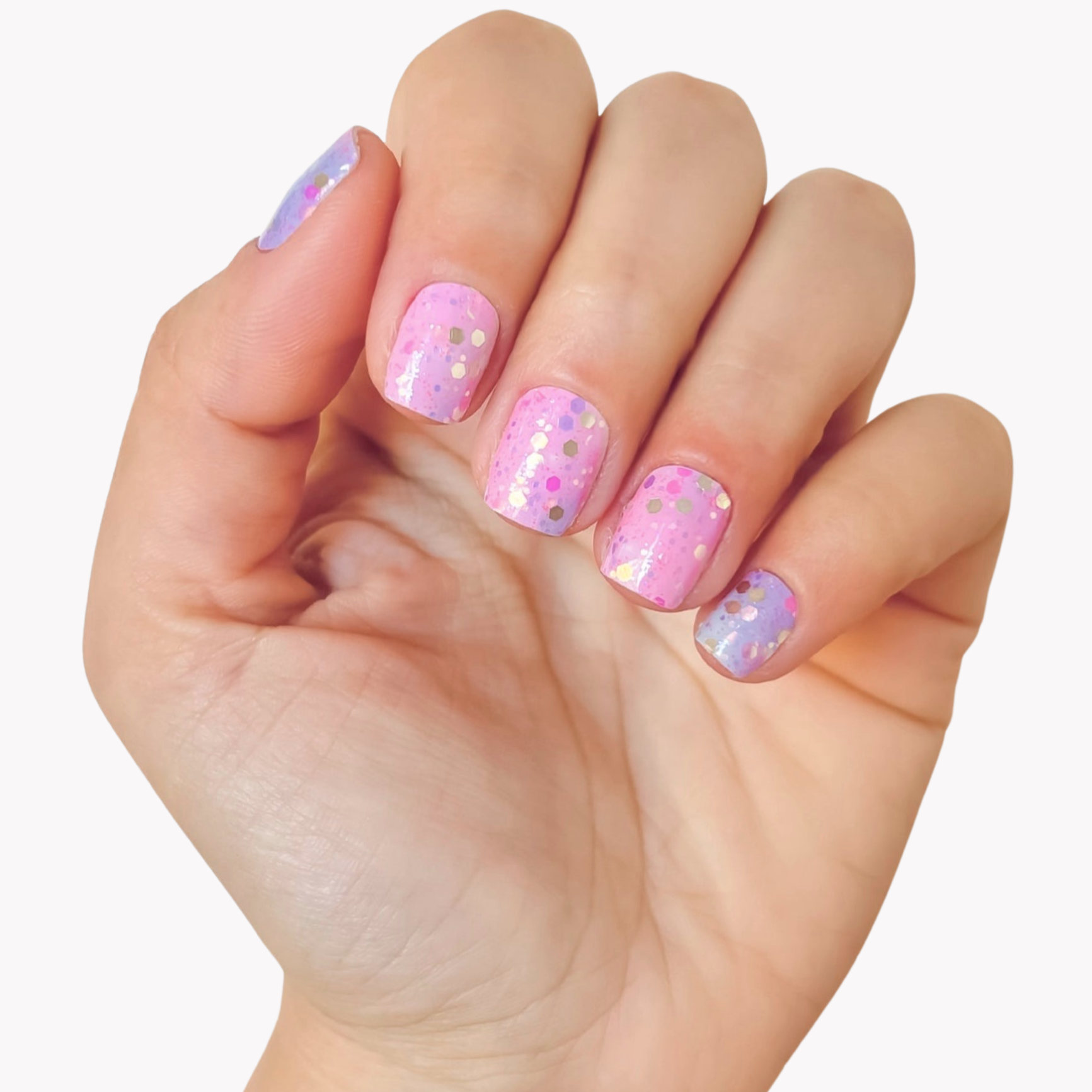 Base inspirada en el aura del arco iris con grandes copos de purpurina. Una versión diferente de los diseños ombré.