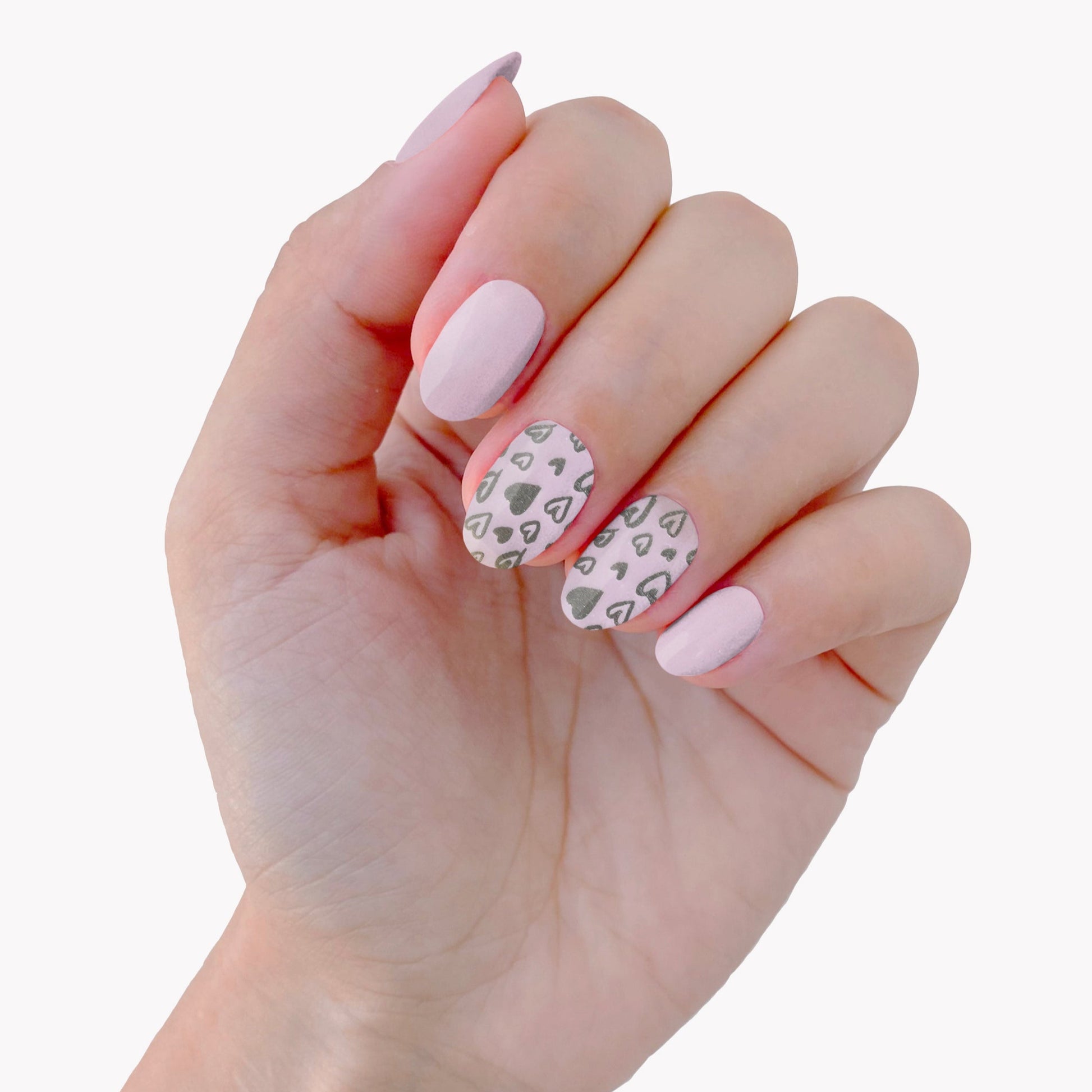 Con su base rosa claro y sus corazoncitos plateados, este diseño te enamorará.