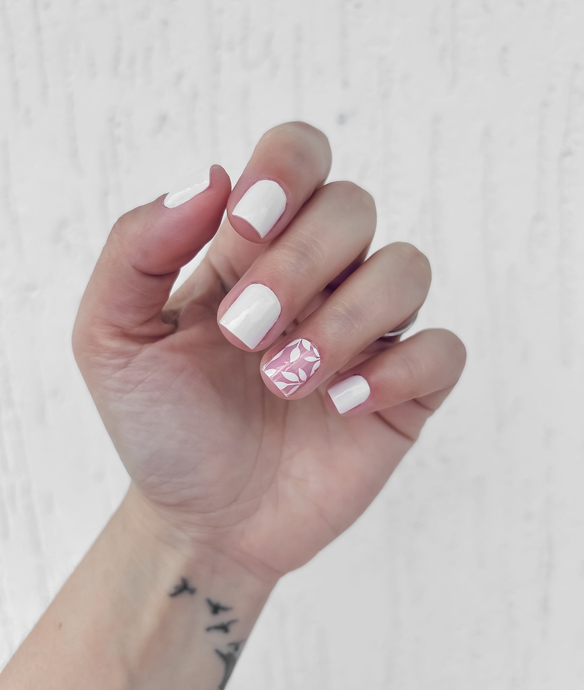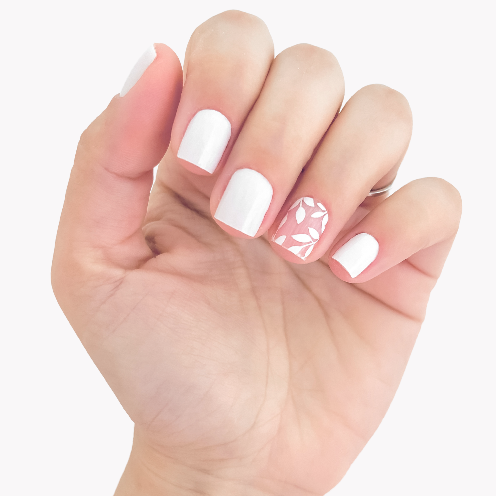 Un dedo blanco puro y otro semitransparente con hojitas.