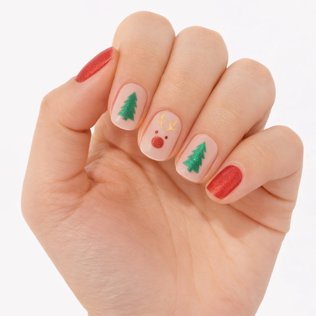 Un diseño navideño minimalista con base nude, árboles verdes y un reno discreto, combinado con acentos rojo mate para un look festivo y limpio